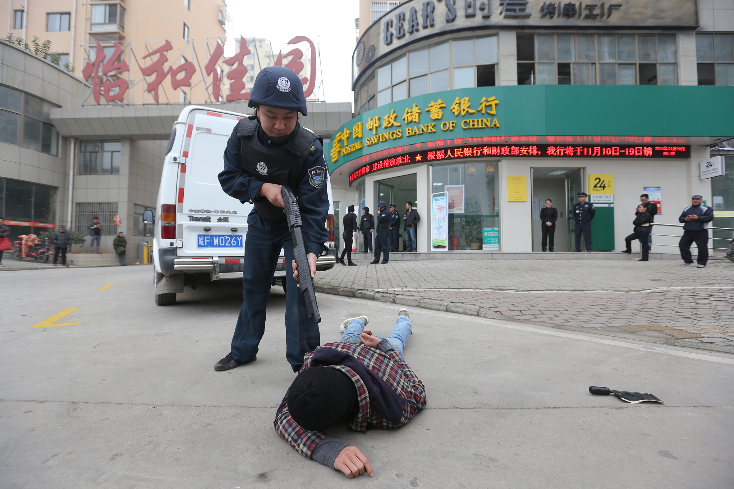 為切實(shí)提高押運(yùn)隊(duì)員安全防范意識(shí),使押運(yùn)隊(duì)員進(jìn)一步熟悉和掌握防暴力搶劫應(yīng)急預(yù)案流程,增強(qiáng)員工應(yīng)對(duì)突發(fā)事件的處置能力和實(shí)戰(zhàn)能力,按照中國郵政儲(chǔ)蓄銀行安全保衛(wèi)工作要求,淮北市保安有限公司聯(lián)合特警支隊(duì)、中國郵政儲(chǔ)蓄銀行于2016年11月19日上午9時(shí)在中國郵政儲(chǔ)蓄銀行惠苑路支行處實(shí)施運(yùn)鈔車突遇犯罪份子持刀搶劫款箱應(yīng)急置預(yù)案聯(lián)合演練。